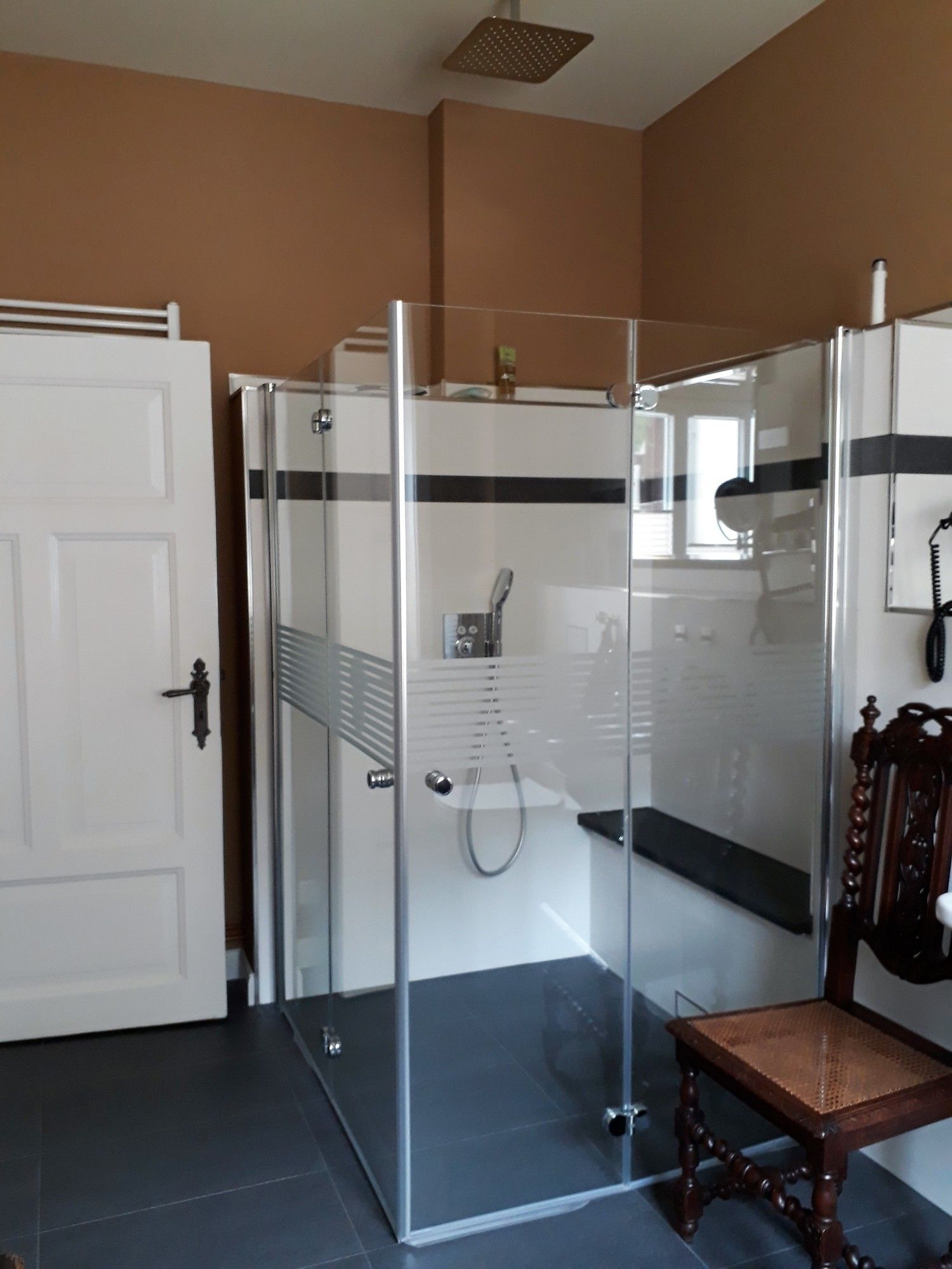übergroße ebenerdige Regenschauer-Dusche, sind seltenen antique Möbelstücken und ausschließlich Echtholzmöbel (außer Küchenmöbel) vorhanden.